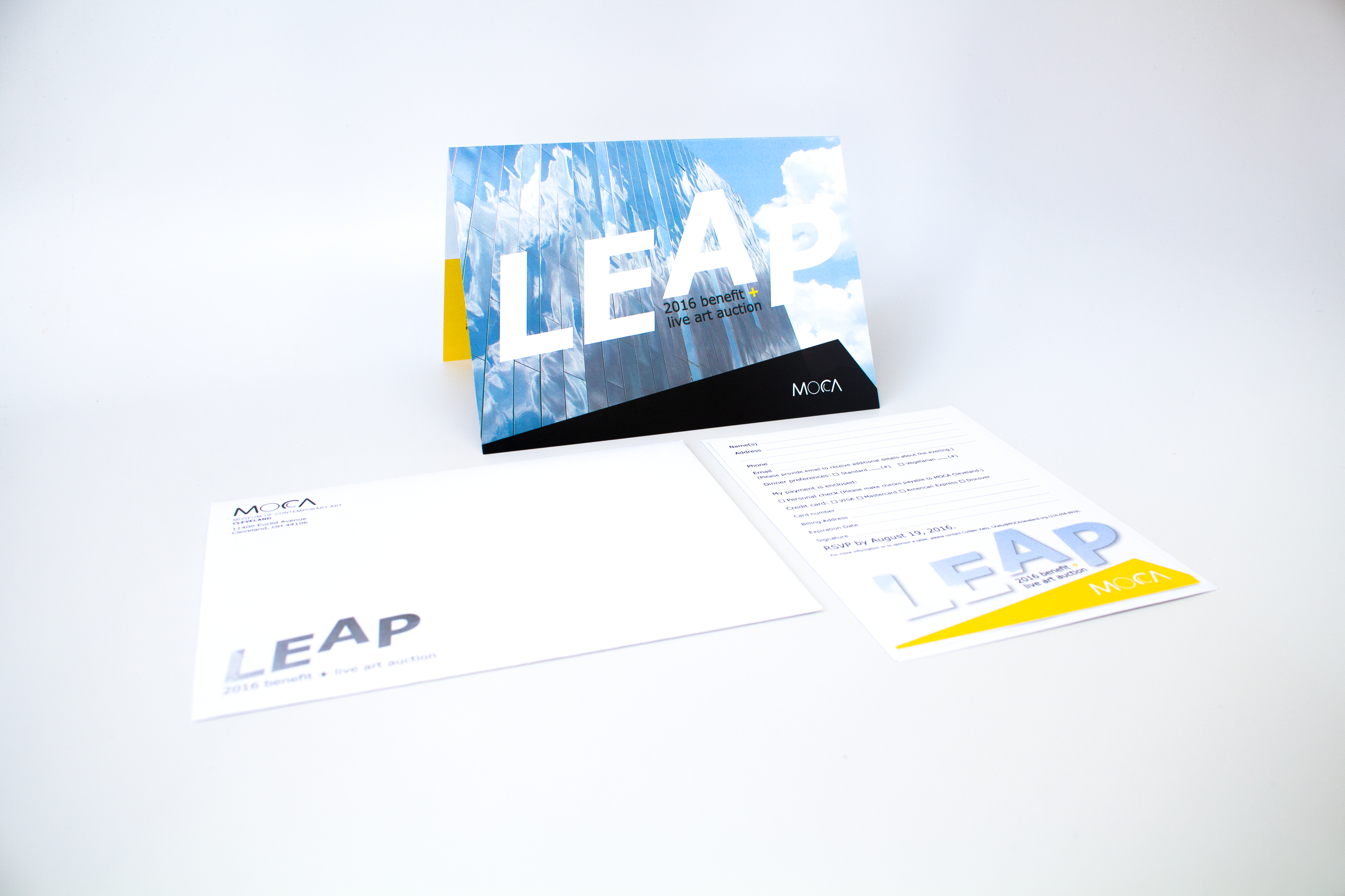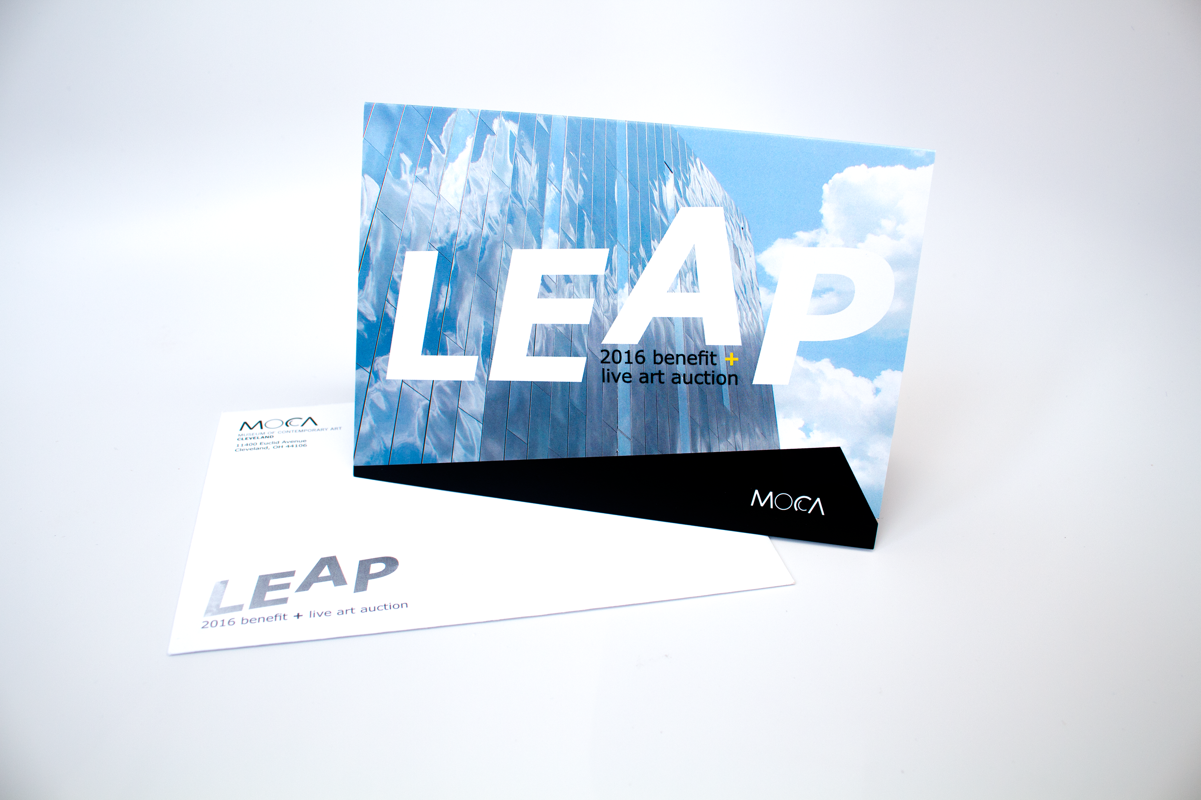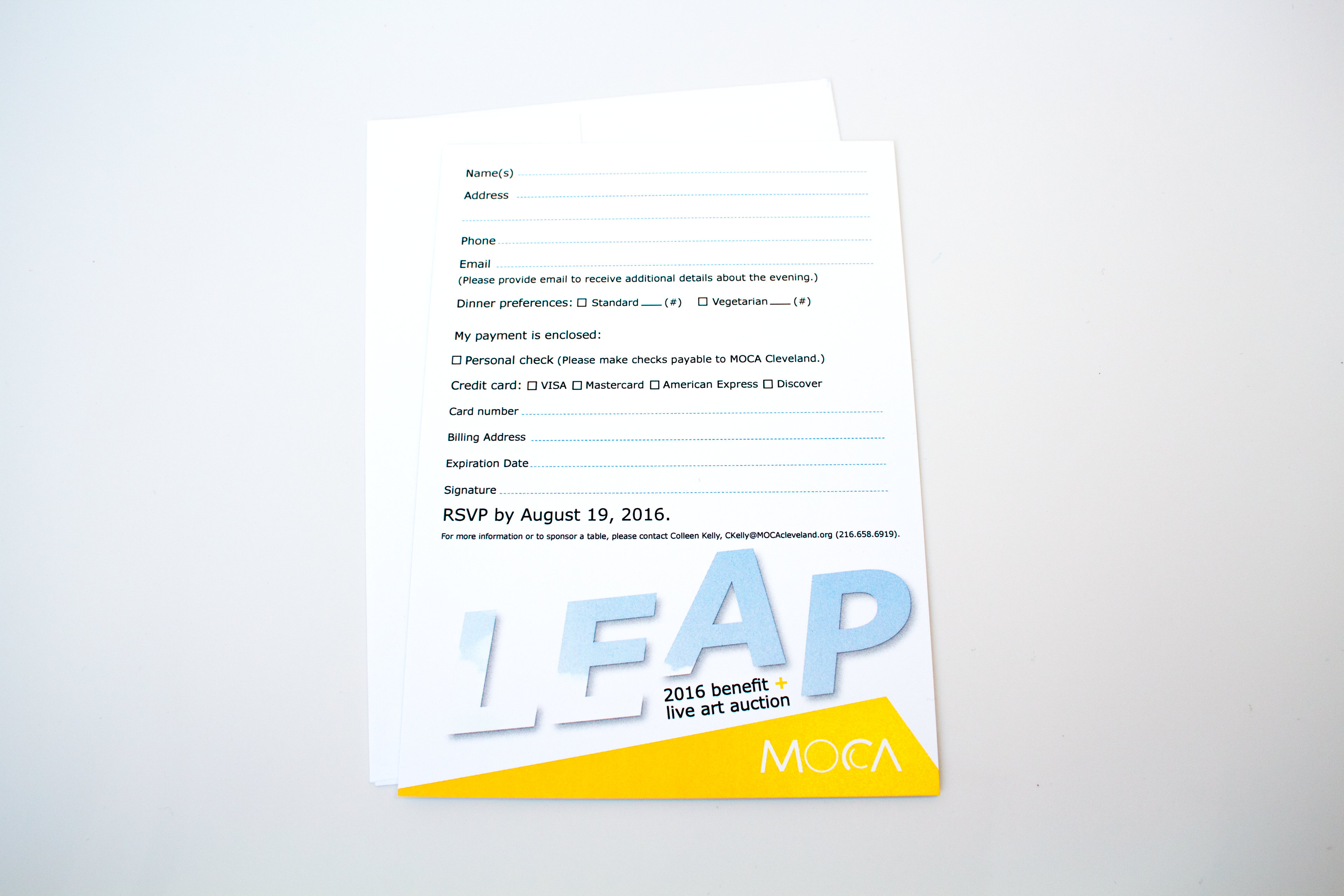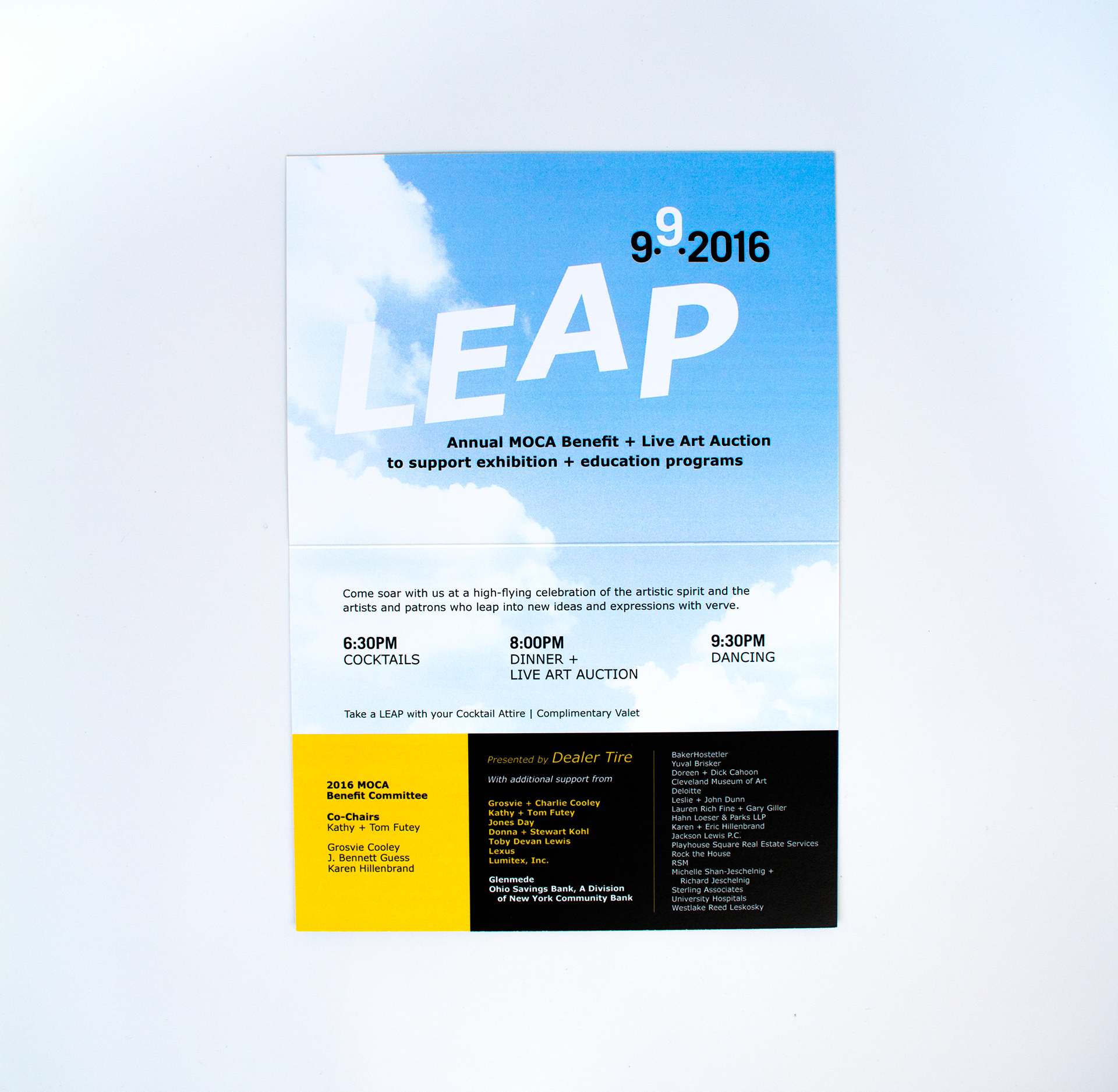 Every September, MOCA Cleveland hosts an annual benefit for the museum. The theme chosen for the 2016 benefit was LEAP. During my summer design fellowship, I designed the identity and invitation for the event.
